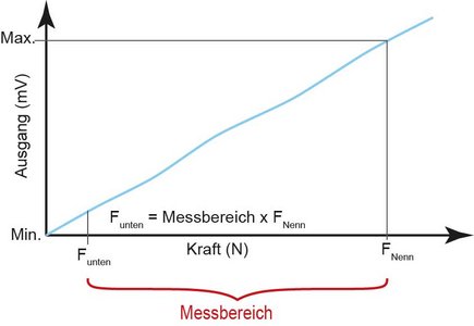 Den Messbereich gibt FMS in Bezug auf die Nennkraft an. Im Bereich zwischen Nennkraft (maximale Kraft) und minimaler Kraft darf der Kraftaufnehmer eingesetzt werden. Darüber wird er überlastet, darunter entspricht die Genauigkeit nicht mehr den Vorgaben.