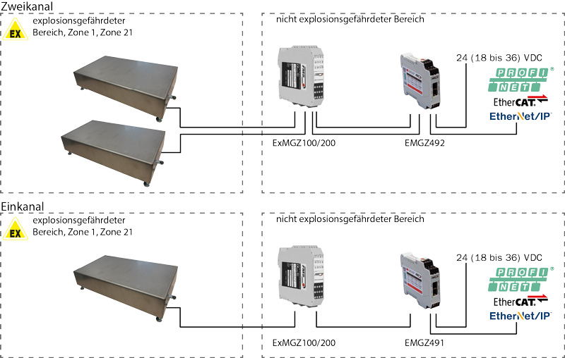 Durch die zusätzliche Verwendung unserer eigensicheren Trennkarte ExMGZ100/200 kann die Plattformwaage zudem sicher in explosionsgeschützten Bereichen eingesetzt werden.